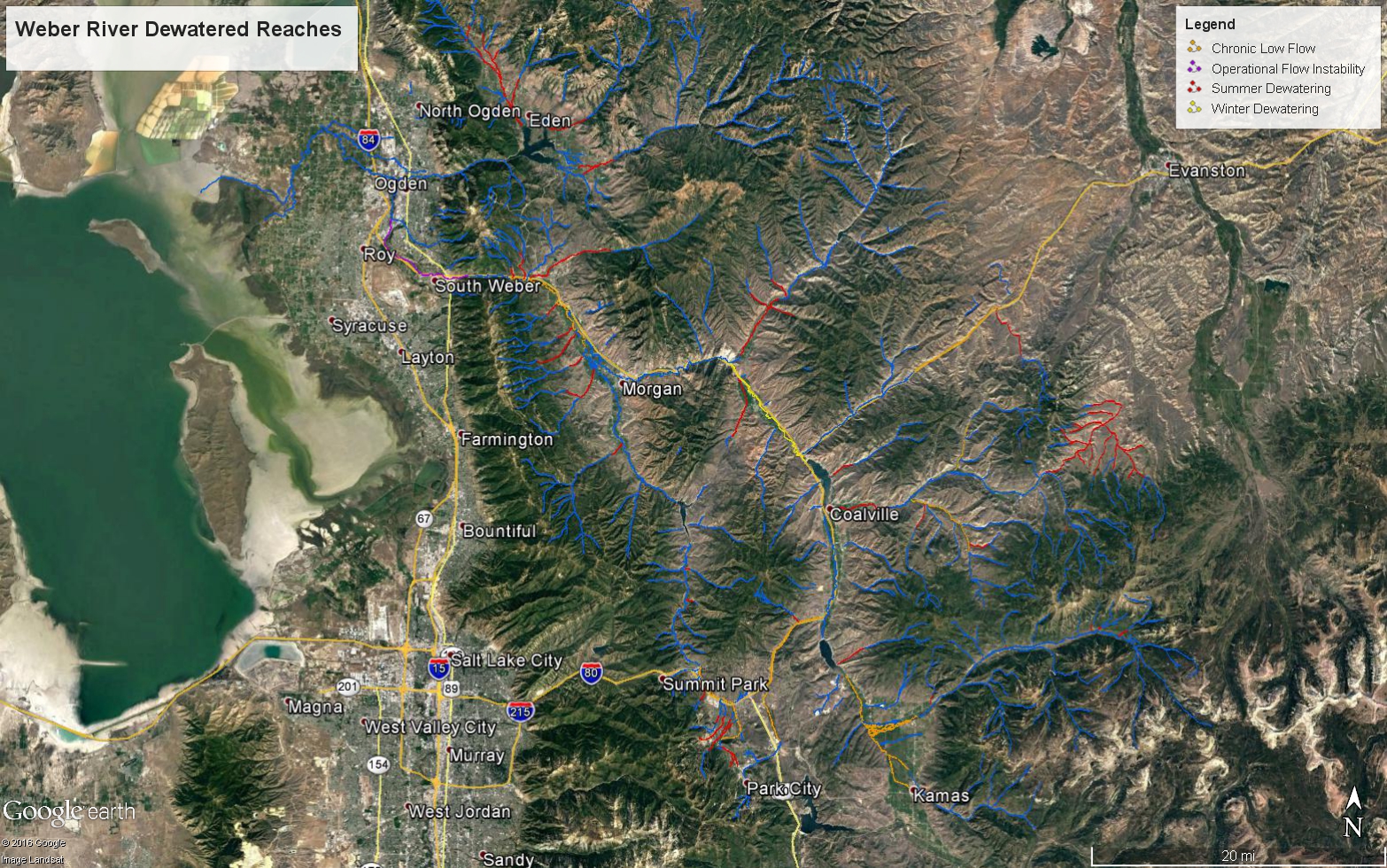 This map shows the results of a collaborative mapping effort in the Weber River identifying critically dewatered reaches. This map and several others across the state help guide our leasing efforts moving into the future. Trout Unlimited map.