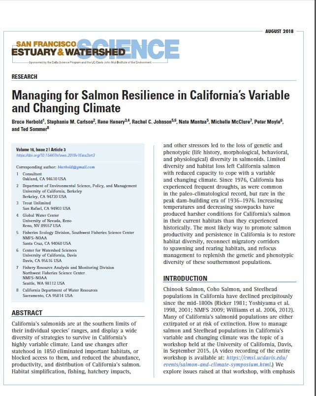 This paper discusses how “habitat simplification, fishing, hatchery impacts, and other stressors led to the loss of genetic and phenotypic (life history, morphological, behavioral, and physiological) diversity in salmonids.” This reduction in diversity and habitat loss have left California salmon less able to cope with a variable and changing climate (increasing temperatures and frequency of drought, coupled with decreasing snowpacks, have produced harsher conditions for California salmon in their current habitats than they experienced historically).