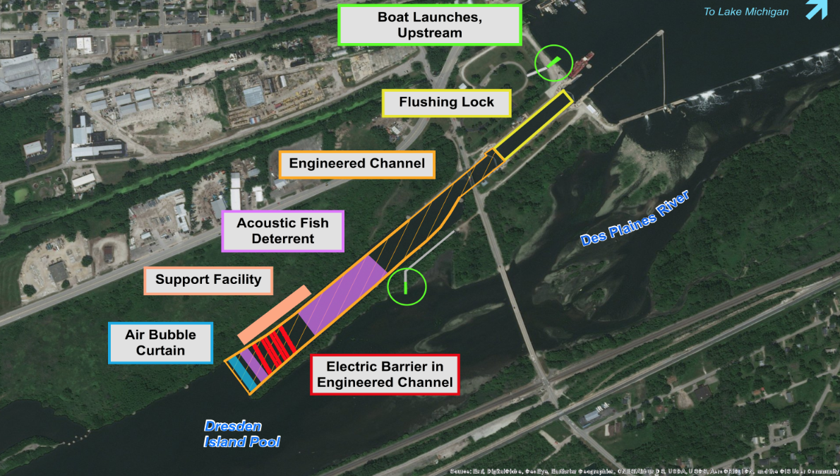 The USACE maintained structural and nonstructural measures including an engineered lock fitted with an electric barrier an acoustic barrier, and an engineered channel to stop aquatic invasive species, while maintaining navigation for shipping. Click here for a summary of the updated plan.