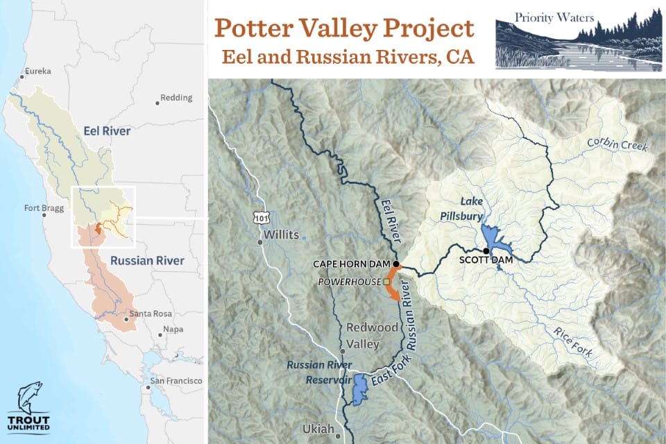 “Few things harm sea-run fish species as much as dams, and no other dams in California block as much undeveloped, high-quality spawning and rearing habitat for steelhead and salmon as the Potter Valley Project dams on the Eel River,” said Brian Johnson, TU’s senior policy advisor for western water and climate. “TU has been investing in the Eel River for decades and working on this hydropower project for more than ten years, and PG&E’s filing confirms that those dams will be coming out.