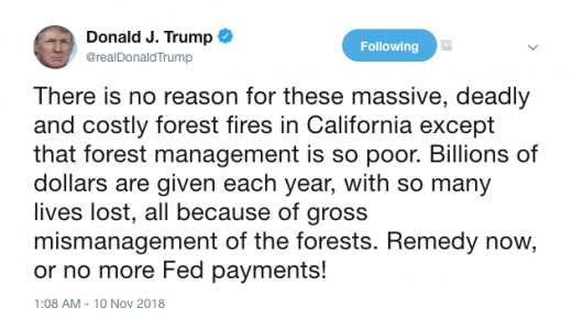 California is in the midst of its most deadly and damaging fire. At least 50 people have died, 6,700 homes burned, and more than 250,000 people evacuated. In response, President Trump tweeted: