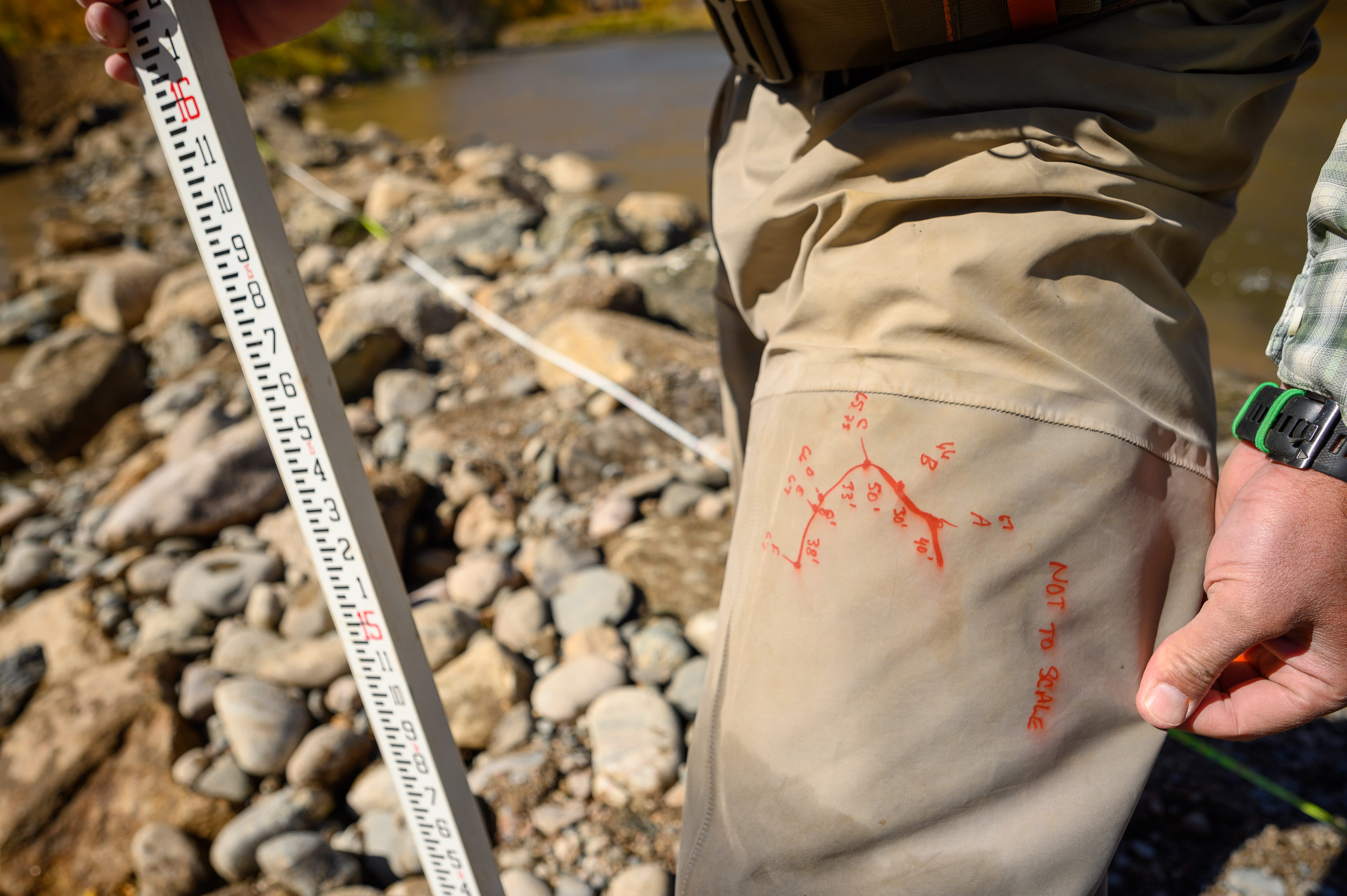 Not blood, just another TU River Champion hard at work on a restoration project No, that’s not blood from a barbed hook wound on his waders. It’s just a drawing in red marker of a river restoration project in progress. Just another of TU’s River Champions hard at work.